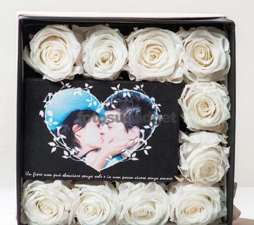 Flower Box con rose stabilizzate e una foto su tela nel formato 10x15cm, crea online il tuo regalo personalizzato con fotosugadget. Box di rose profumate disponibile in vari colori, puoi personalizzarlo con una foto su tela realizzata con un speciale tessuto scamosciato, un regalo unico.