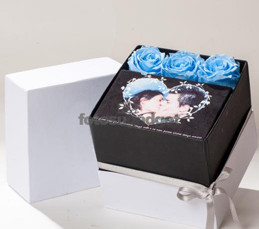Flower Box con rose stabilizzate profumate e una stampa su tela 10x15 cm, crea online il tuo regalo personalizzato con fotosugadget. Box di rose stabilizzate in vari colori, puoi personalizzarlo con una stampa su tela scamosciata, un regalo unico.