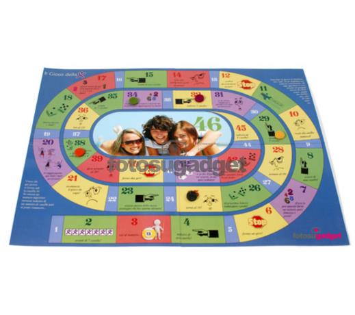 Il Gioco della X personalizzato con la tua fotografia. Un gioco da tavolo formato da un percorso da completare affidandosi unicamente alla propria fortuna nel lanciare i dadi. Il tabellone da gioco è formato da un percorso a spirale formato da 46 caselle, personalizzabile con una fotografia o un testo. Ogni giocatore è contraddistinto da una differente pedina in feltro colorata e sono compresi due dadi. Un gioco semplice e immediato, adatto ad ogni età!