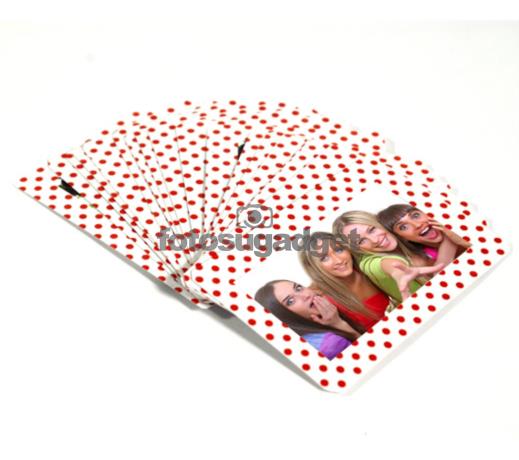 Carte da gioco Francesi personalizzate con fotografie e testi. Eleganti, originali, lussuose a basso prezzo, 54 carte per mazzo. Un regalo raffinato per amici o clienti, per le loro partite a Bridge, Poker, Burraco e tanti altri giochi. Un modo elegantissimo per farsi ricordare nei momenti di relax. Carte da gioco perfette per ogni serata di gioco: sul retro delle 54 carte è stampata la tua foto preferita! Ideale per associazioni, club o come regalo originale! Le carte da gioco personalizzate sono confezionate in una pratica custodia bianca. Personalizza le carte da poker con ben 54 foto stampate con l’alta qualità su carta da 350 gr. e plastificate lucide avanti e dietro.Originale idea regalo adatta per ogni ricorrenza.
