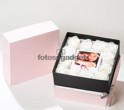 Flower Box con rose stabilizzate, icluso nel box 10 foto effetto polaroid, crea online il tuo regalo personalizzato con fotosugadget. Box di rose stabilizzate e profumate sono disponibili in vari colori, il Flower box puoi personalizzarlo con 10 foto polaroid nel formato 10x10 cm, un regalo unico e originale. Ampia scelta di colori sia del box che delle rose stabilizzate.